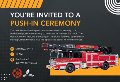 The Oak Forest Fire Department invites the community to a traditional push-in ceremony to dedicate its new fire truck on Monday, July 14 at 10 a.m. at Fire Station 2 located at 4907 W. 167th Street. The dedication will include a blessing of the truck, followed by the truck being pushed by hand into the apparatus bay of the firehouse.